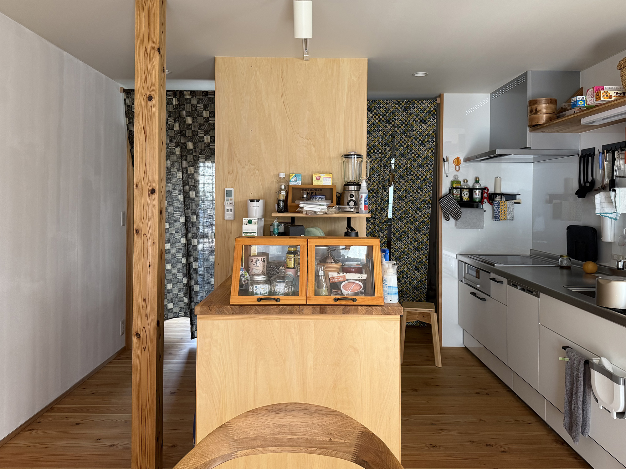 住宅の東側部分に当たる独立キッチンと洋間を繋げ、「LDK+家事スペース」としました。リビングの南窓からの明るさが奥のキッチンまで届くようになりました。中央の島(造作家具のかたまり)は、冷蔵庫スペースと造作収納台。こちらでぐるりと廻れる便利な動線を作り出しています。