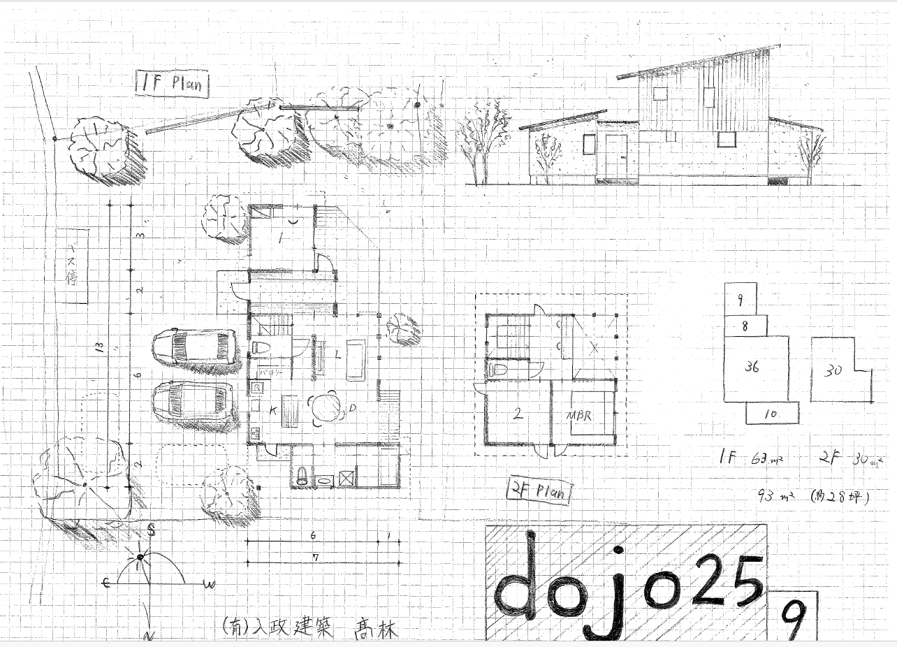 建物は5M×8Mの2階建てをベースに、下屋を連ねる構成。