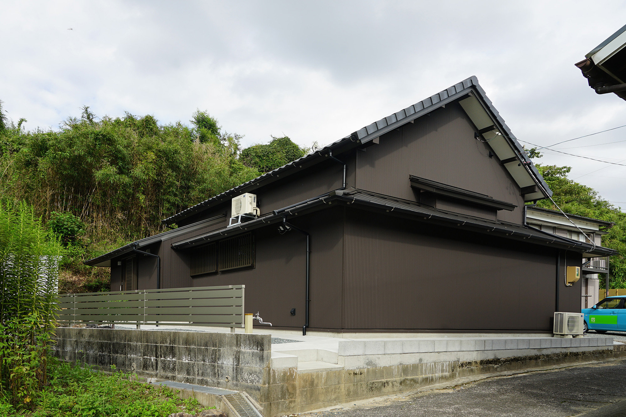 外壁は、ガルバリウム鋼鈑へ。屋根は重量のある日本瓦から軽量瓦「ルーガ」、下屋はガルバリウム鋼板へ変更。建物全体の軽量化により、地震の揺れや雨漏りリスクを大幅に軽減しています。