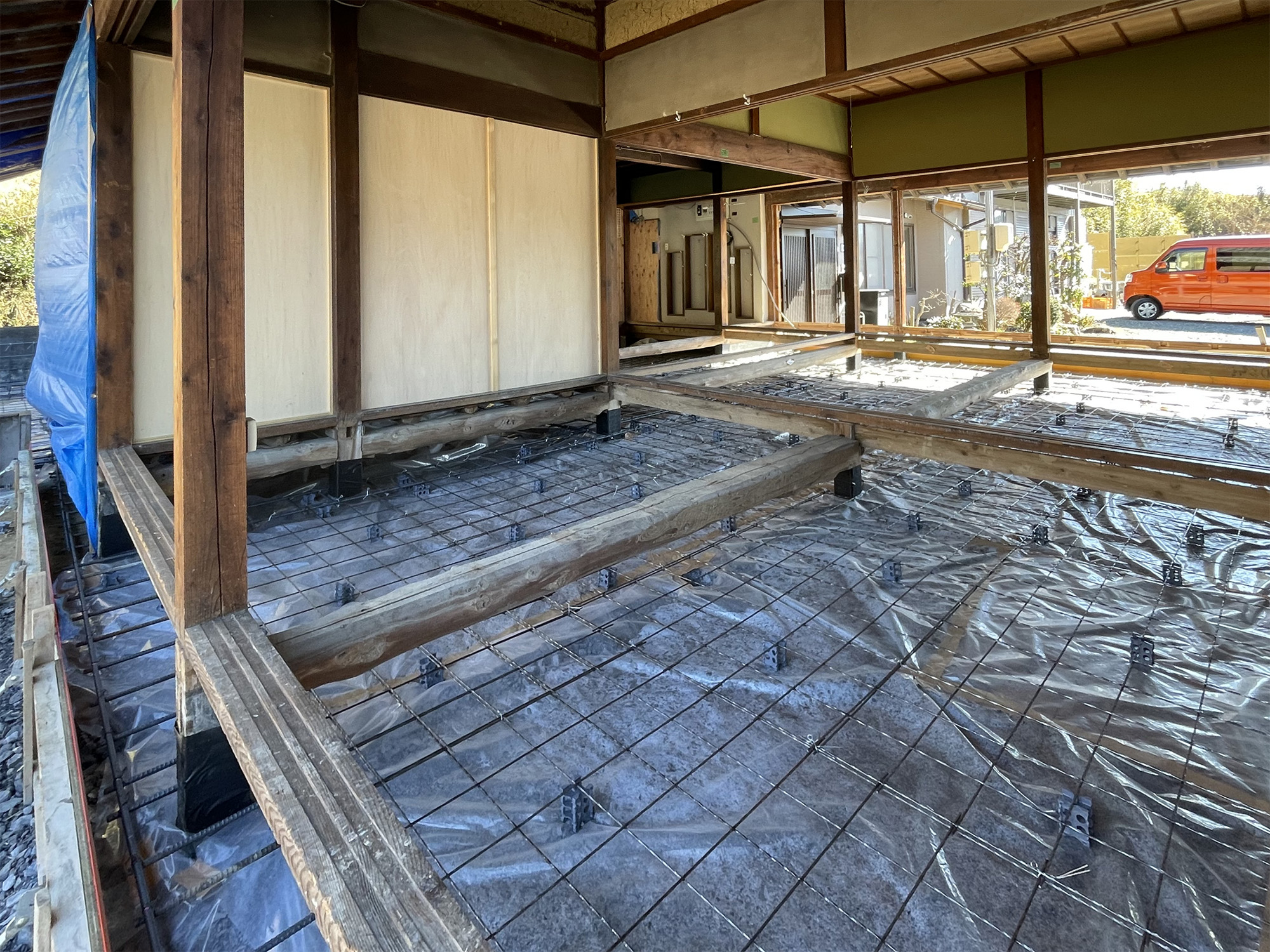 古い「石場建て」の構造を活かしながら、耐震と防湿を目的に鉄筋コンクリートを打設し、基礎全体を補強しました。