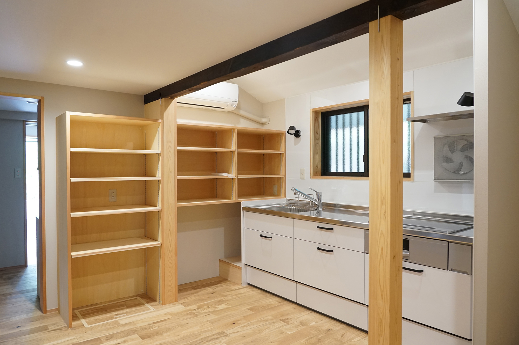 リフォーム形跡があった洗面廻りに、キッチン機能もプラスしました。レトロな換気扇が印象的な空間に、古材をアクセントとして取り入れ、シンプルながら味わいある台所になりました。また、収納するものに合わせて大きな可動棚も計画しました(家電棚と収納棚)。オープン収納は使いやすさ優先です。