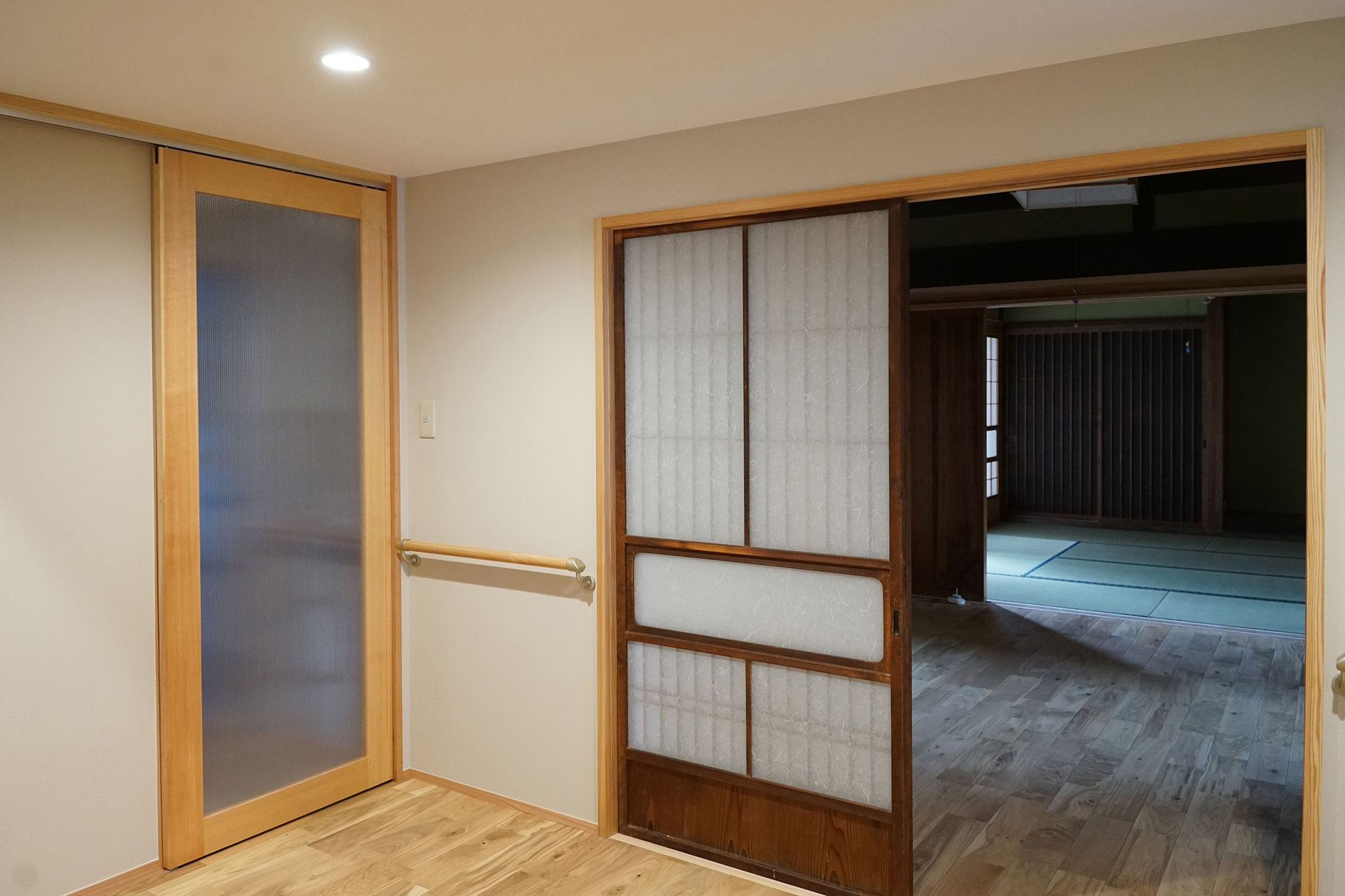 先祖代々、家族の歴史が刻まれた空間を残すため、美しく古びた建具や和室の内壁・天井は可能な限り再利用しました。ぶかぶかしていた畳や傾きのあった床は、基礎から補強して水平を確保。既にリフォーム済みであった一部屋を残し、すべてがバリアフリーとなりました。