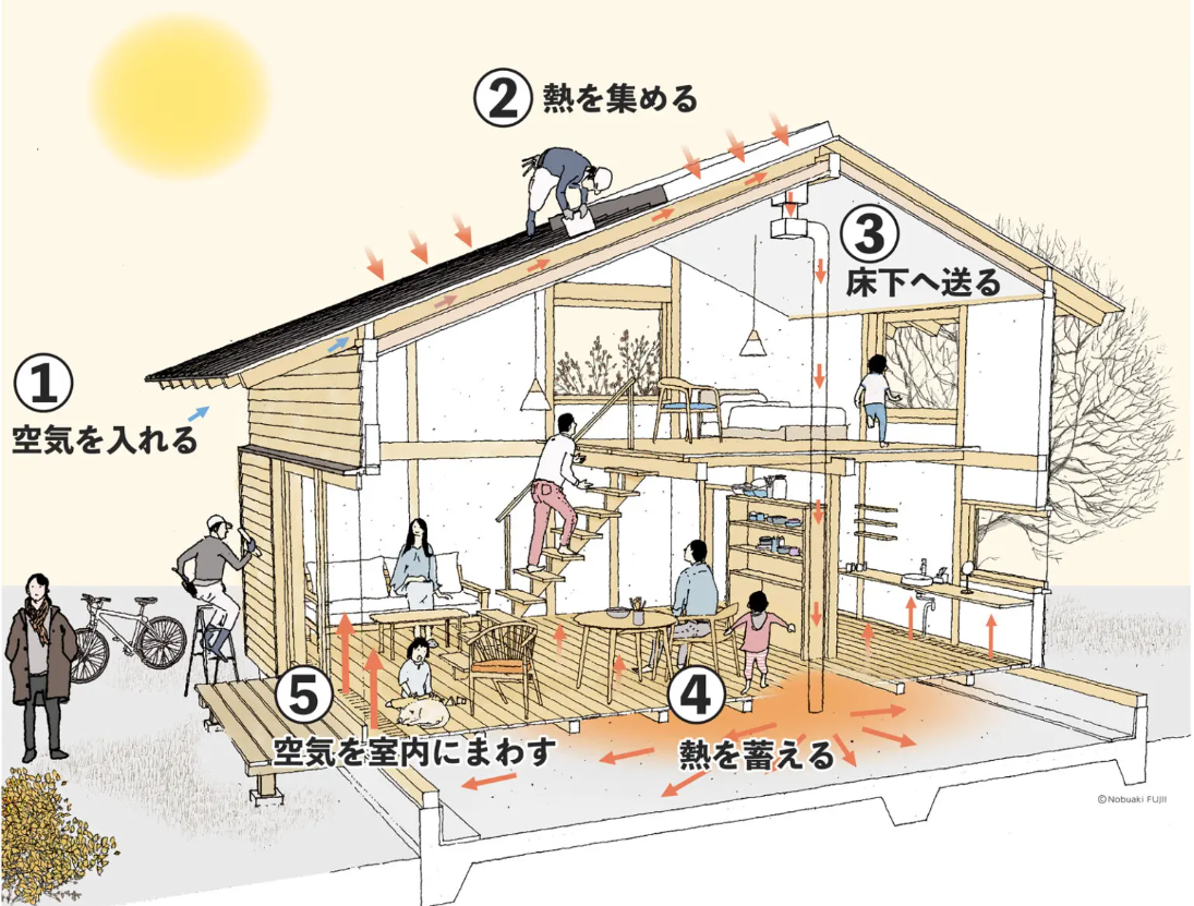 太陽が出ていれば、体温程度のやさしい暖気を取り込み、その空気が家じゅうをゆっくりと巡っていく。