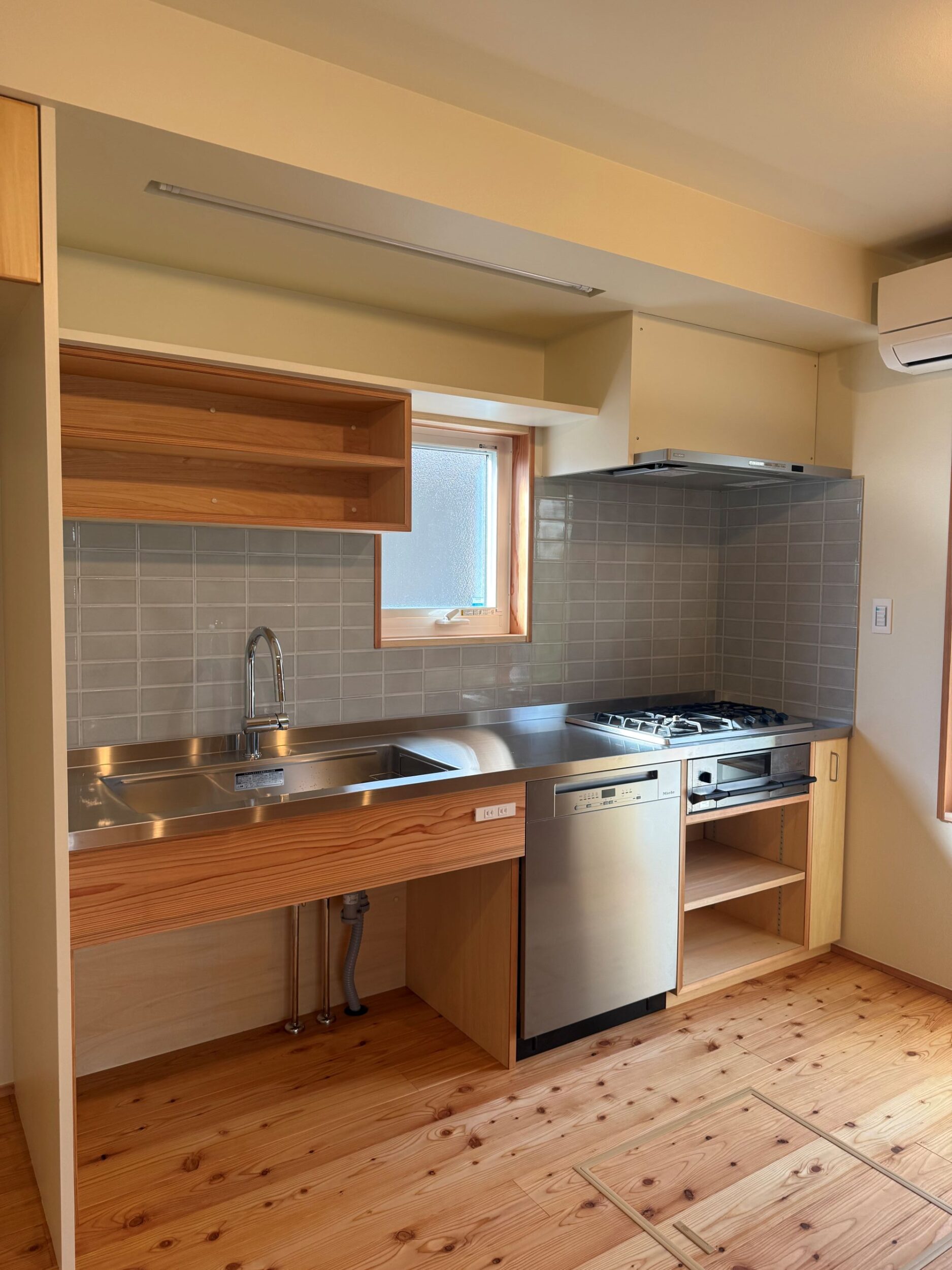シンク上にあるオープン棚は、日常使いの食器を置くのに重宝します。