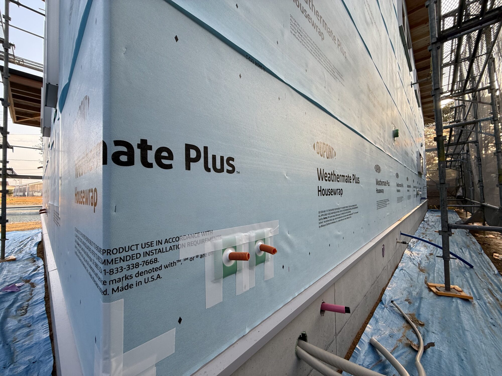 入政建築では、新築時の第二次防水として「ウェザーメイトプラス」という透湿防水シートを採用しています。