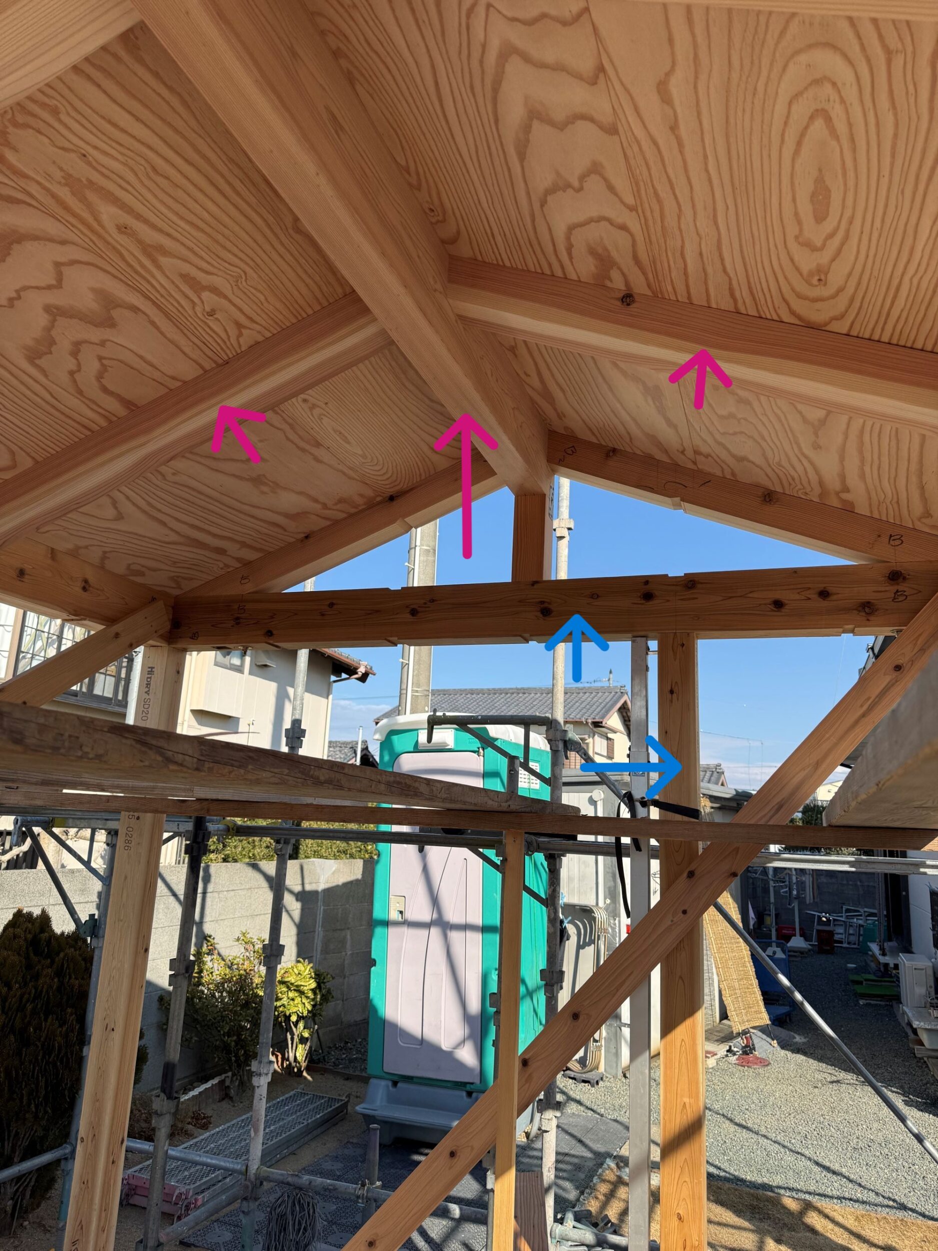 そのため、見える部分である棟木と登り梁以外の構造材には、人工乾燥材を使用しています。
