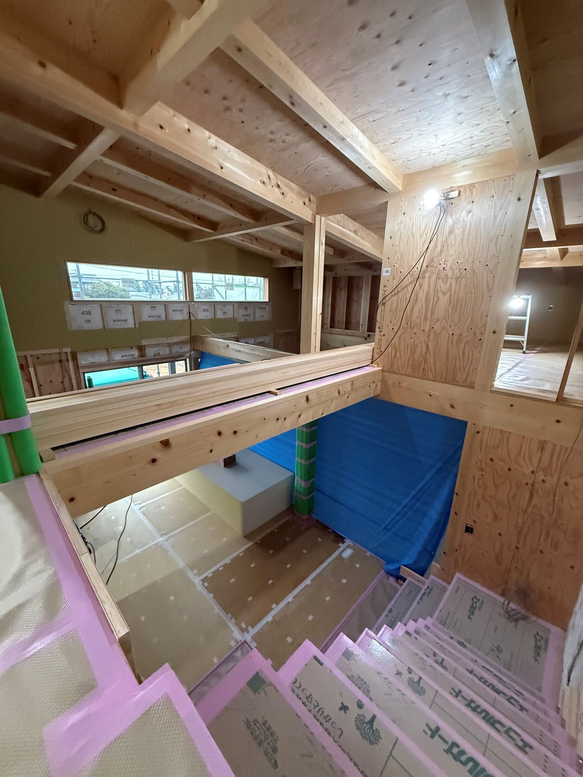 外部木下地が完成し、内部下地の木工事が進んでいます。