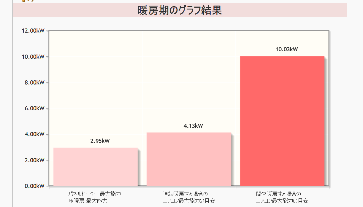 この結果をもとに、14畳用のエアコンを採用しました。(20畳用では、能力が大きすぎると判断しました。)